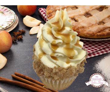 A caramel cupcake filled with little apple bites slow cooked in cinnamon and sugar topped with vanilla cream surrounded with a streusel crumb and finished with a caramel drizzle.