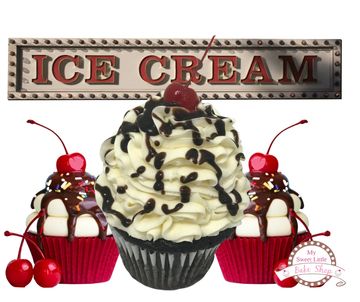 A chocolate cupcake with a chocolate soak that is topped off with our signature white chocolate cream drizzled with fudge and finished off with a cherry.