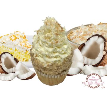 A soft coconut cupcake filled with luscious coconut cream topped with our signature white chocolate cream surrounded with a streusel crumb and toasted coconut.