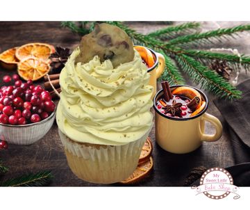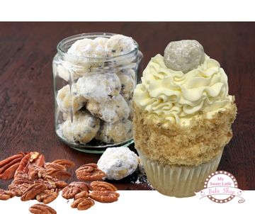 A vanilla cupcake with a pecan filling topped with our signature white chocolate cream that is surrounded by crushed pecan shortbread and finished with a snowball cookie.