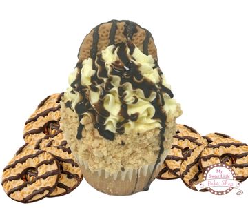A soft vanilla cupcake with an indulgent fudge filling that is topped with a vanilla cream surrounded by a shortbread crumble drizzled with fudge and topped with a fudge striped cookie.