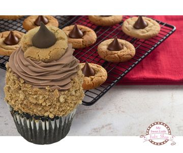 A rich chocolate cupcake with a peanut butter filling topped with chocolate cream surrounded by crushed peanut butter and chocolate cookies and garnished with a peanut butter blossom.