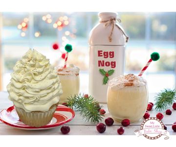 A light rum flavored cupcake with an eggnog custard topped with our signature white chocolate cream that is sprinkled with nutmeg.