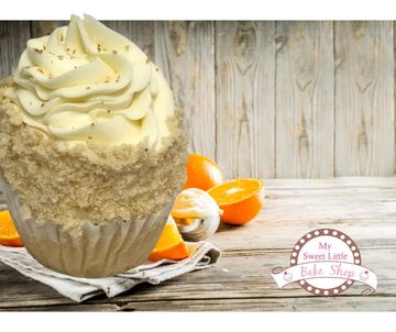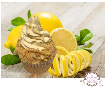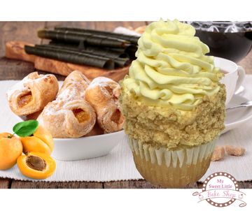 A butter cupcake with a luscious cream cheese and apricot filling topped with vanilla cream that is surrounded by crushed butter cookies.