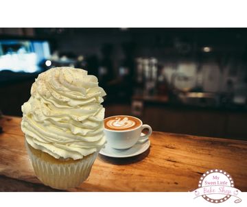A soft vanilla cupcake with a sweet cream soak filled with a coffee cream that is topped with our signature white chocolate cream and dusted with sweet coffee.