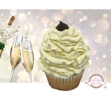 A champagne cupcake with a champagne cream filling topped with our signature white chocolate cream that is topped with a chocolate kiss.