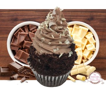 A rich chocolate cupcake with a luscious white chocolate filling that is topped off with chocolate cream surrounded by crushed chocolate cookies and finished off with white chocolate shavings.
