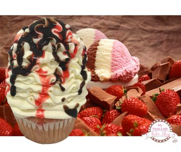 A sweet strawberry cupcake that is filled with chocolate cream topped with our signature white chocolate cream that is drizzled with chocolate and strawberry sauce.
