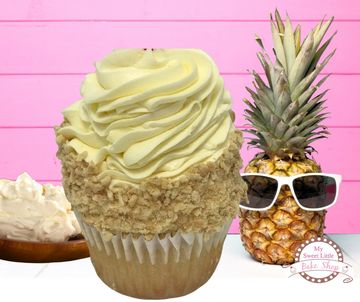 A luscious pineapple cupcake with a cream cheese filling topped with vanilla cream that is surrounded by crushed butter cookies.