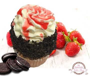 A strawberry cupcake with a cookies and cream filling that is topped with our signature white chocolate cream surrounded by crushed chocolate cookies and finished off with a strawberry drizzle.