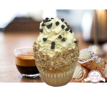 A soft cinnamon and sugar cupcake filled with a sweet cannoli cream topped with our signature white chocolate cream that is surrounded by crushed sugar cone and sprinkled with mini chocolate chips.